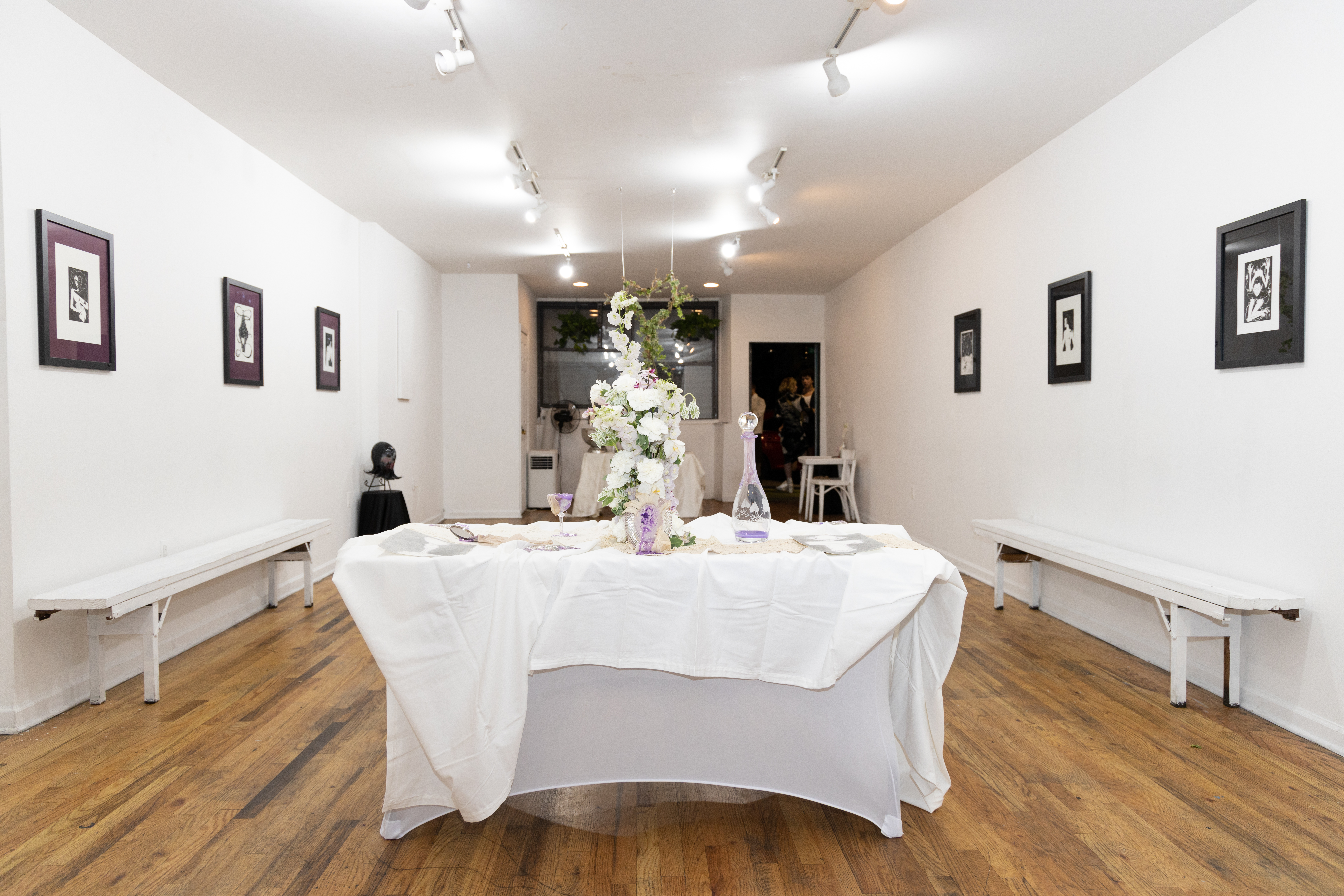 Mimic (exhibit C, bedchamber), 2022, picture frame, glove, acrylic, rhinestones, Trap (exhibit D, cellar), 2022, decanter, glove, acrylic, rhinestones, Trap (exhibit B, dining hall), 2022, coupe, glove, acrylic, rhinestones, Trap, (exhibit A, powder room), 2022, compact, glove, acrylic, rhinestones